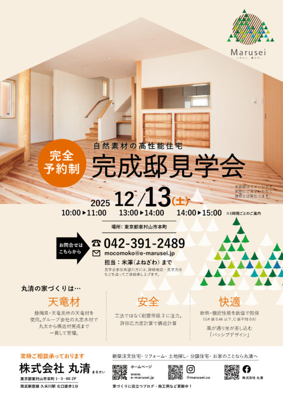 お客様感謝祭『もこもこフェスタ 2025 まる博(まるはく)』と同時開催で、東京都東村山市本町にて完全予約制の完成邸見学会を開催いたします。 丸清の家づくりは、「天竜材、安全、快適」をコンセプトに、自然素材を活かした高性…