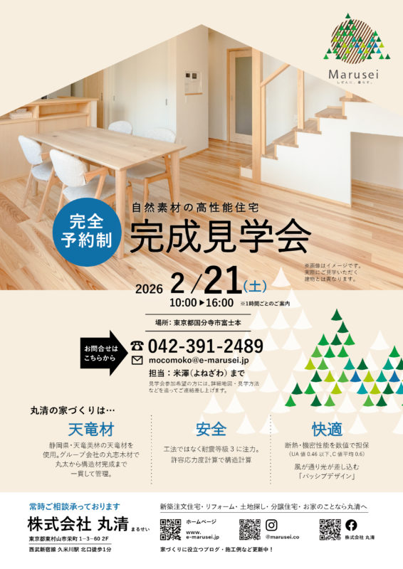 東京都国分寺市富士本にて、完全予約制の完成見学会を開催いたします。 丸清の家づくりは、「天竜材、安全、快適」をコンセプトに、自然素材を活かした高性能住宅を提供しています。注文住宅を検討されているお客様はこの機会にぜひ、丸…