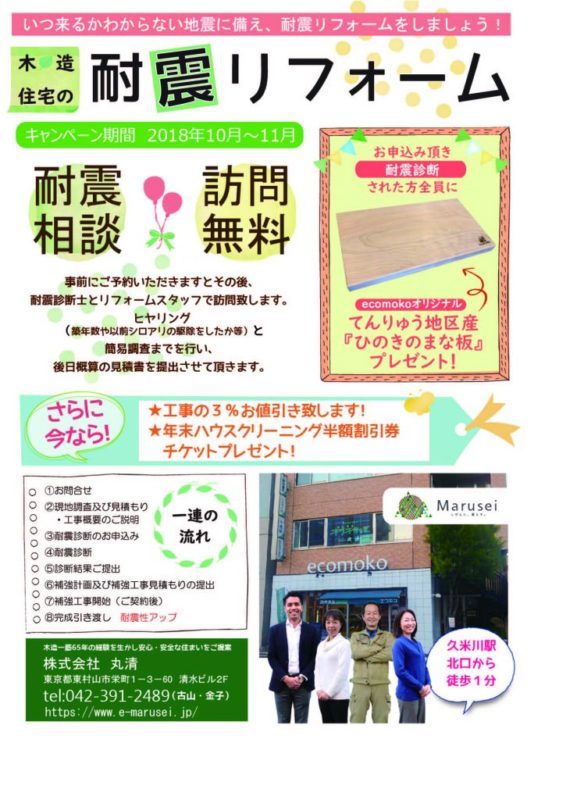 耐震リフォームキャンペーン開催中! 耐震リフォームに関するご相談に、専門スタッフがお答えします。 現地調査・お見積り・工事概要のご説明までは無料です! ぜひ、この機会にご検討くださいね! お問い合わせはこちらまで 株式会…