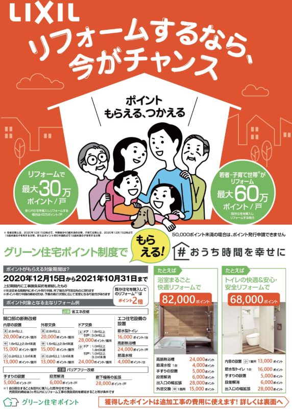 リフォームするなら今がチャンス! 最大60万ポイント、もらえる・つかえるキャンペーン中!! ポイント対象となる主なリフォーム例と、獲得ポイントの目安は以下の通り。 獲得したポイントで追加工事をすればとってもお得にリフォー…