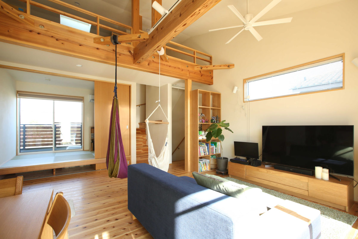 環境にやさしい暮らしを大切にするご家族が選んだのは「自然に溶け込む家づくり」。 遊び心いっぱいのインテリアと、窓から見える緑豊かな風景が印象的な住まいです。 梁を見せた天井はロフトに繋がっています。お子さまたちはハンモッ…